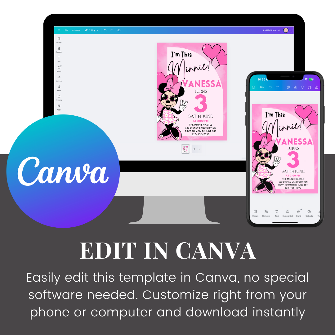 Minnie Mouse Birthday Invitation | Editable Girl Party Invite | Pink Minnie Theme Template – Instant Download