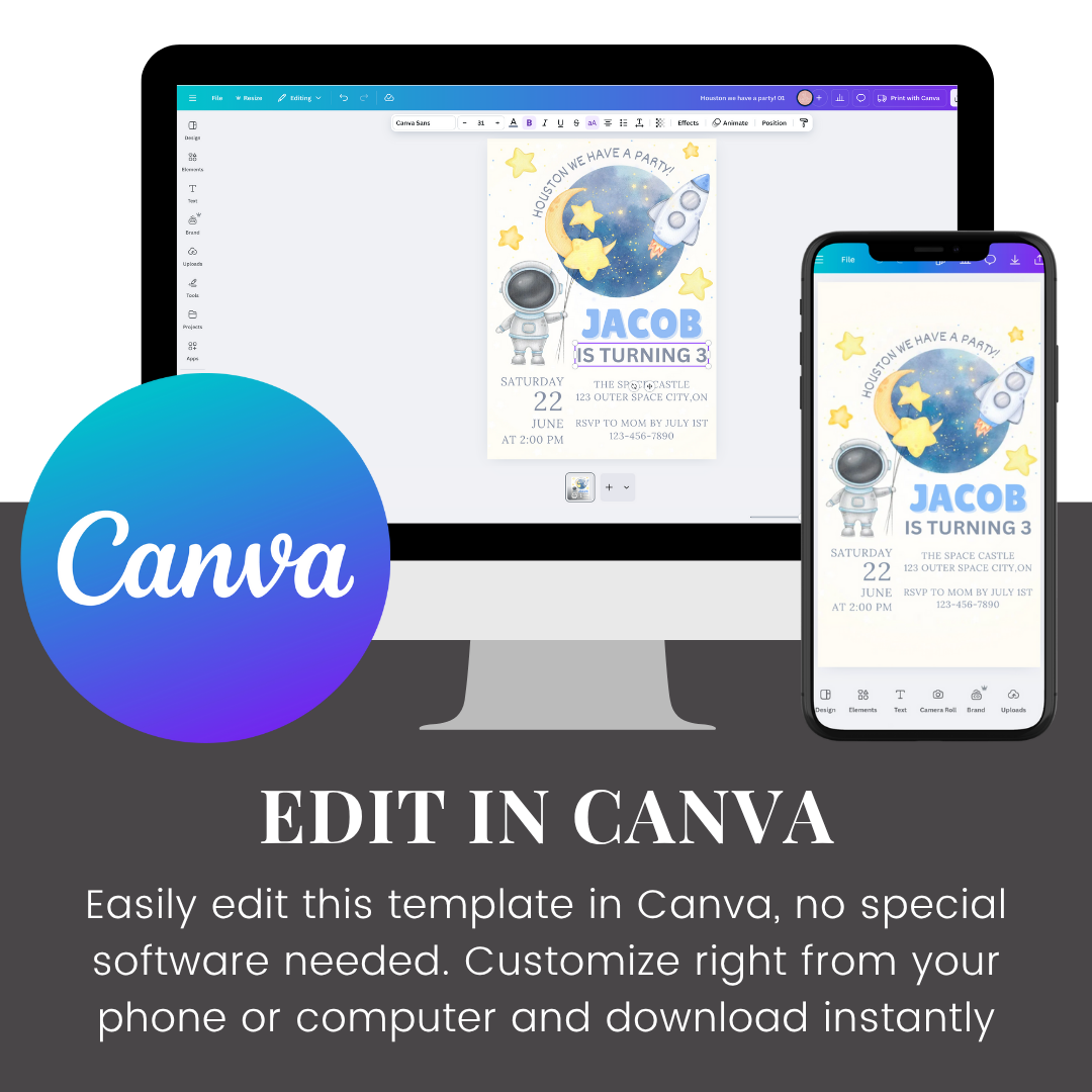 Blast off into birthday fun with this adorable Space Birthday Invitation 🚀✨Featuring a cute astronaut, rocket ship, and a dreamy sky, this invitation is perfect for your little explorer’s special day. Easily personalize the text using Canva, no special software or design skills needed. You can change the name, age, date, time, and address to make it uniquely yours. Then download and print at home or share digitally via text or email!